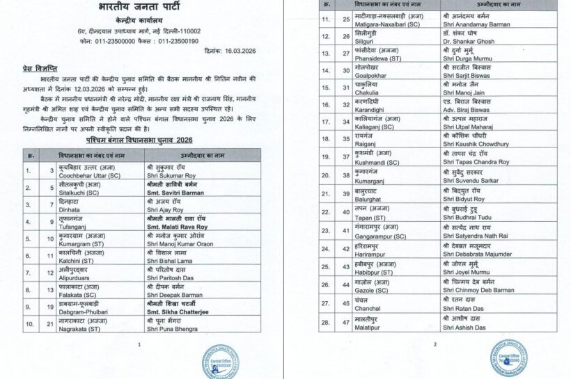 नई दिल्ली/कोलकाता/तिरुवनंतपुरम, 16 मार्च 2026 भारतीय जनता पार्टी (बीजेपी) ने आगामी पश्चिम बंगाल और केरल विधानसभा चुनावों के लिए उम्मीदवारों की पहली सूची जारी कर दी है। यह घोषणा चुनाव आयोग द्वारा चुनाव कार्यक्रम की अधिसूचना के बाद तेजी से हुई है, जिसमें दोनों राज्यों में बीजेपी ने अपनी रणनीति को मजबूत करने का…