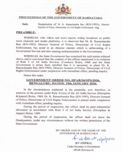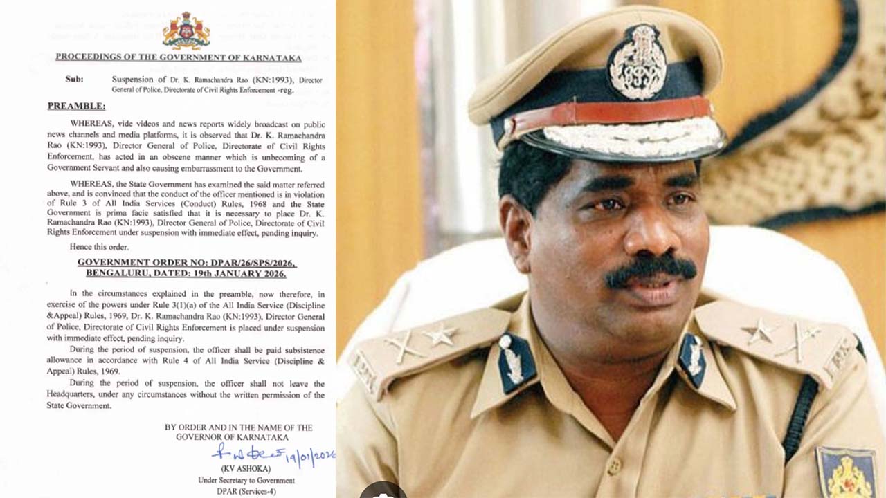 कर्नाटक पुलिस विभाग में बड़ा भूचाल आ गया है। सोशल मीडिया पर वायरल हुए आपत्तिजनक वीडियो और फोटोज के बाद राज्य सरकार ने डायरेक्टर जनरल ऑफ पुलिस (डीजीपी), डायरेक्टरेट ऑफ सिविल राइट्स एन्फोर्समेंट (डीसीआरई) डॉ. के. रामचंद्र राव को तत्काल प्रभाव से सस्पेंड कर दिया है। यह कार्रवाई सोमवार रात (19 जनवरी 2026) को की गई, जब वीडियो में डीजीपी को पुलिस वर्दी में अपने कार्यालय चैंबर में महिलाओं के साथ अनुचित व्यवहार करते हुए दिखाया गया।
