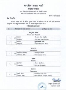 BJP ने एक साथ कई राज्यों के उपचुनावों के लिए उम्मीदवार घोषित किए। जम्मू-कश्मीर के बडगाम से आगा सैयद मोहसिन, ओडिशा के नुआपाड़ा से जय धोलाकिया और तेलंगाना के जुबली हिल्स से लंकाला दीपक रेड्डी को टिकट दिए गए हैं।