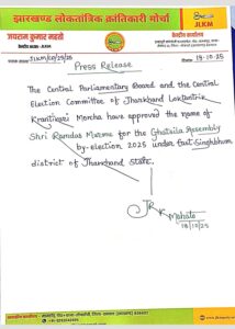 झारखंड के घाटशिला विधानसभा उपचुनाव में सियासी सरगर्मी तेज हो गई है। जयराम महतो की झारखंड लोकतांत्रिक क्रांतिकारी मोर्चा (JLKM) ने रामदास मुर्मू को अपना उम्मीदवार घोषित किया है। रामदास मुर्मू 2024 के विधानसभा चुनाव में भी इस सीट पर JLKM के टिकट पर चुनाव लड़ चुके हैं, हालांकि तब उन्हें हार का सामना करना पड़ा था। उन्हें लगभग 14 हजार कुरमी महतो वाले विधानसभा में 9 हजार वोट मिला था। इस बार उनकी उम्मीदवारी ने उपचुनाव में त्रिकोणीय मुकाबले की संभावना को और मजबूत कर दिया है।