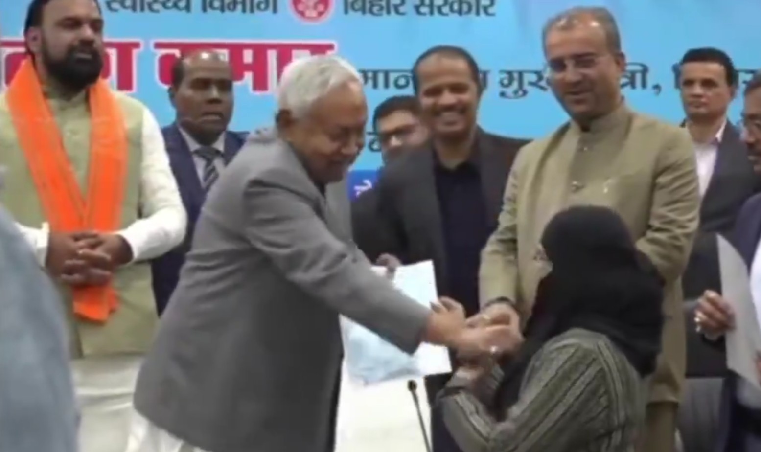 बिहार के मुख्यमंत्री नीतीश कुमार सोमवार को पटना स्थित मुख्यमंत्री आवास (1 अणे मार्ग) में आयोजित एक कार्यक्रम में 1283 आयुष डॉक्टरों को नियुक्ति पत्र वितरित कर रहे थे। इस दौरान एक मुस्लिम महिला डॉक्टर नुसरत परवीन हिजाब पहने मंच पर पहुंचीं, तो मुख्यमंत्री ने पहले उन्हें नियुक्ति पत्र सौंपा और फिर हिजाब की ओर इशारा करते हुए पूछा, “ये क्या है जी?”महिला डॉक्टर ने जवाब दिया, “हिजाब है सर।” इसके बाद नीतीश कुमार ने कहा, “हटाइए इसे” और खुद अपने हाथ से उनका हिजाब हटा दिया। इस घटना का वीडियो सोशल मीडिया पर तेजी से वायरल हो गया। वीडियो में महिला डॉक्टर कुछ पलों के लिए असहज नजर आईं, जबकि आसपास मौजूद लोग हंसते दिखे। मंच पर मौजूद डिप्टी सीएम सम्राट चौधरी ने मुख्यमंत्री को रोकने की कोशिश की, लेकिन तब तक हिजाब हटा दिया गया था। बाद में अधिकारियों ने महिला को दोबारा नियुक्ति पत्र थमाया और मंच से जाने का इशारा किया।