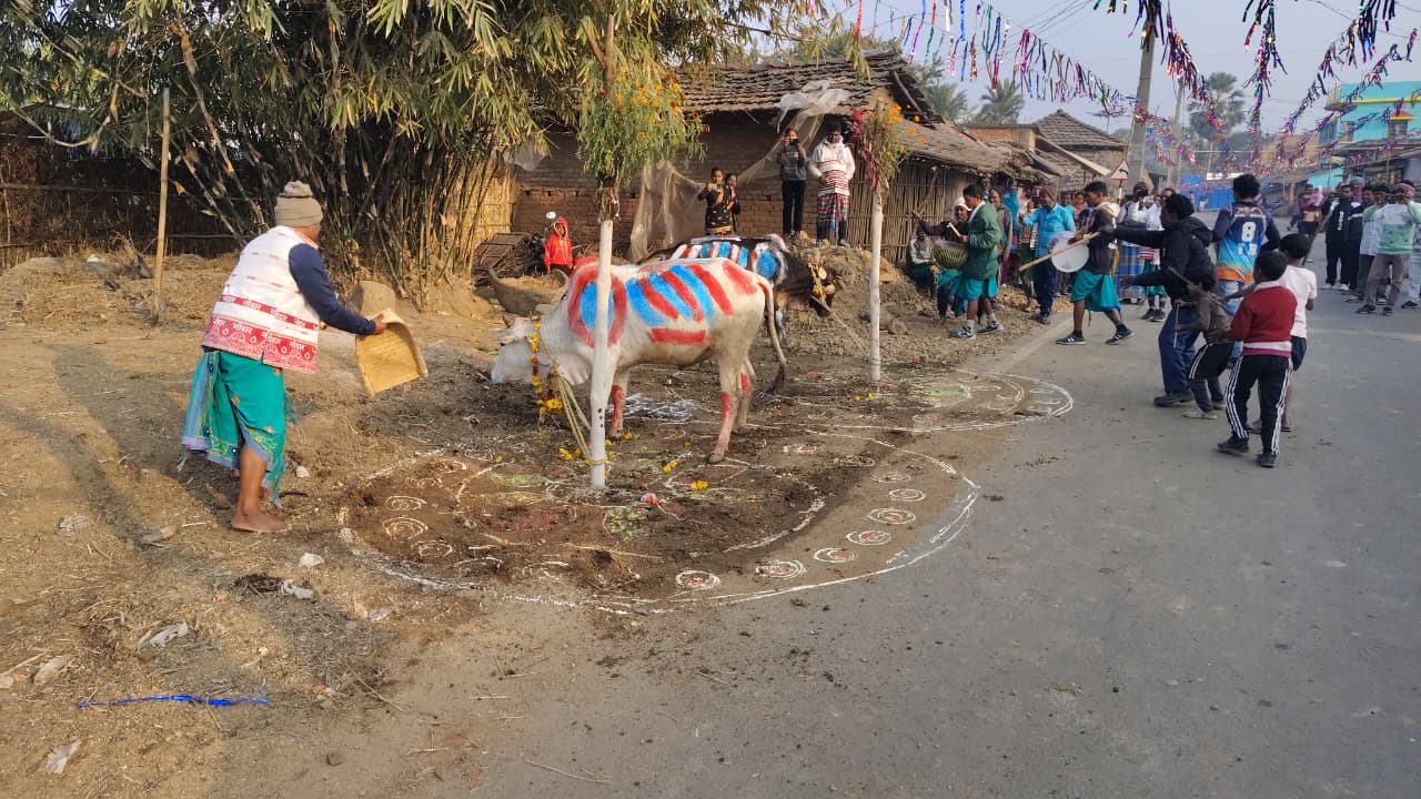 यह पवित्र अनुष्ठान जोगमांझी नारायण बेसरा के घर के सामने संपन्न हुआ, जिसमें बड़ी संख्या में ग्रामीणों ने उत्साहपूर्वक भाग लिया। परंपरा के अनुसार, बैल के सींगों में सिंदूर और तेल लगाया गया, उसे फूलों की माला पहनाई गई, जिसमें पकवान और रुपये भी सजाए गए। इसके बाद कुल्हि (घर के दामाद) द्वारा घर के सामने खूंटा गाड़ा गया। पूजा-अर्चना के पश्चात दामाद ने बैल को माला पहनाकर बाहर ले जाकर खूंटे से बांध दिया।